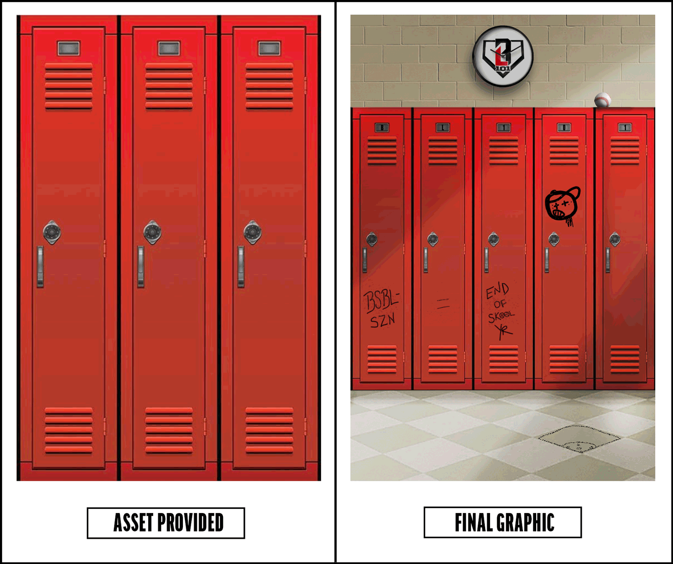 A single asset was provided to me with the simple directive to create an image for the company’s ‘Back to School’ campaign. I utilized the asset of 3 plain red school lockers, multiplied them and created a school hallway with an opening locker door while incorporating the company’s branding.